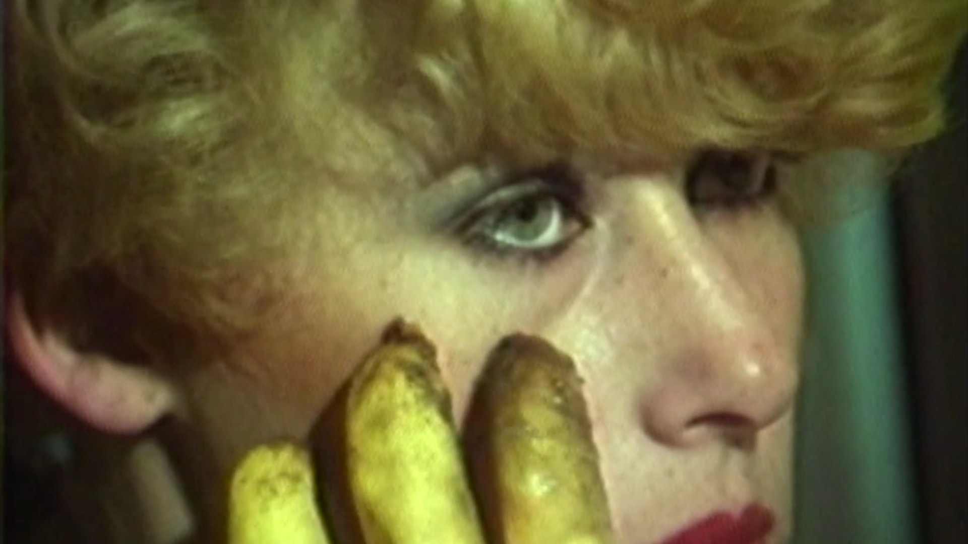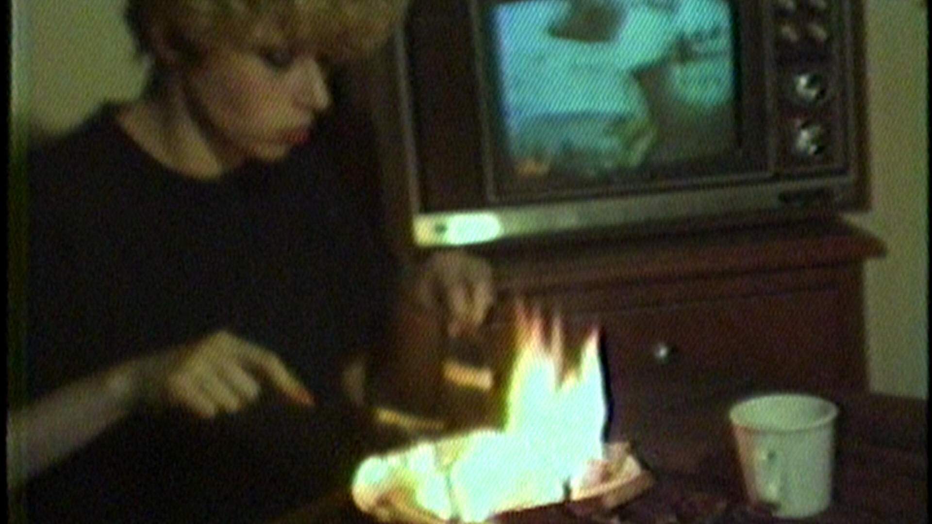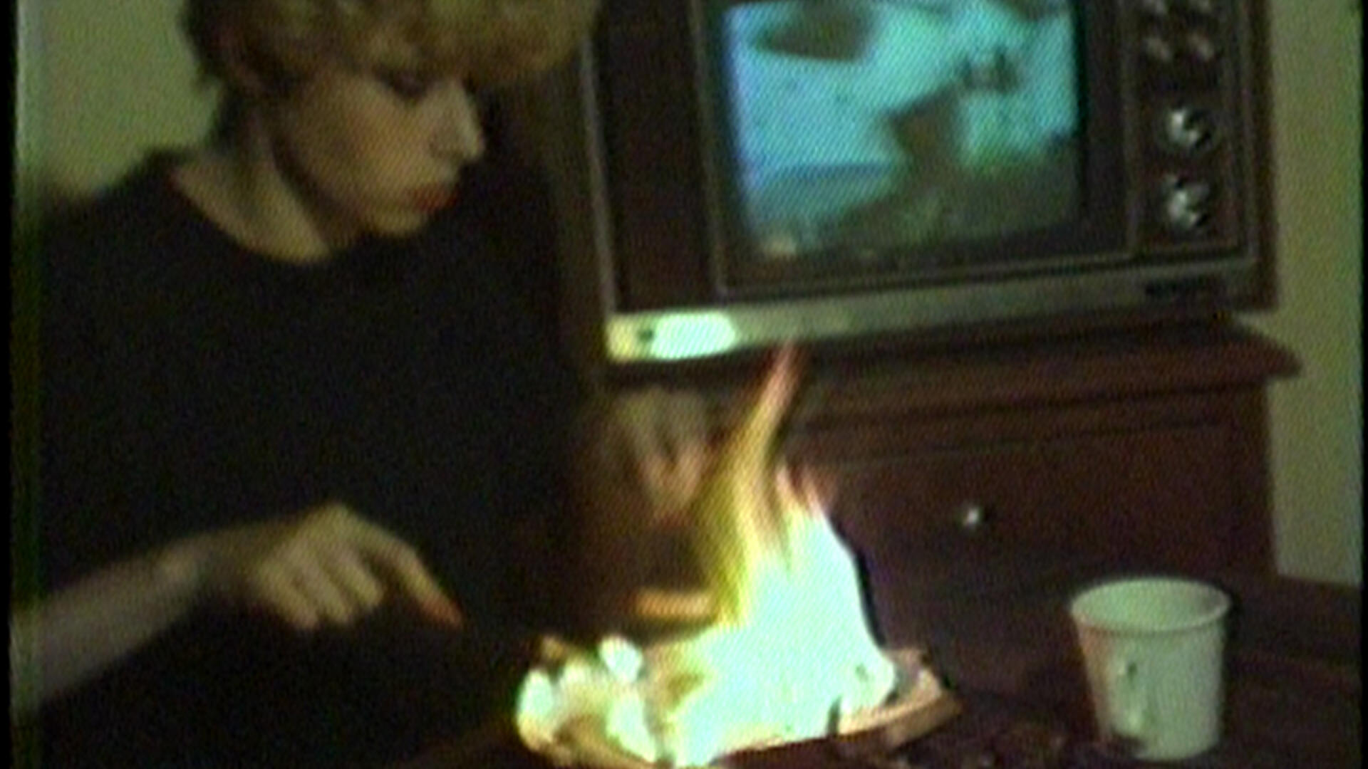 Nine Silent tapes, each between four and eight minutes long, intended to be screened on a loop in late night establishments. The first three videos are portraits of women. Maria is eating in front of the television when a hand engulfed in flames appears and burns her meal. Daily routine is interrupted by danger and desire.
